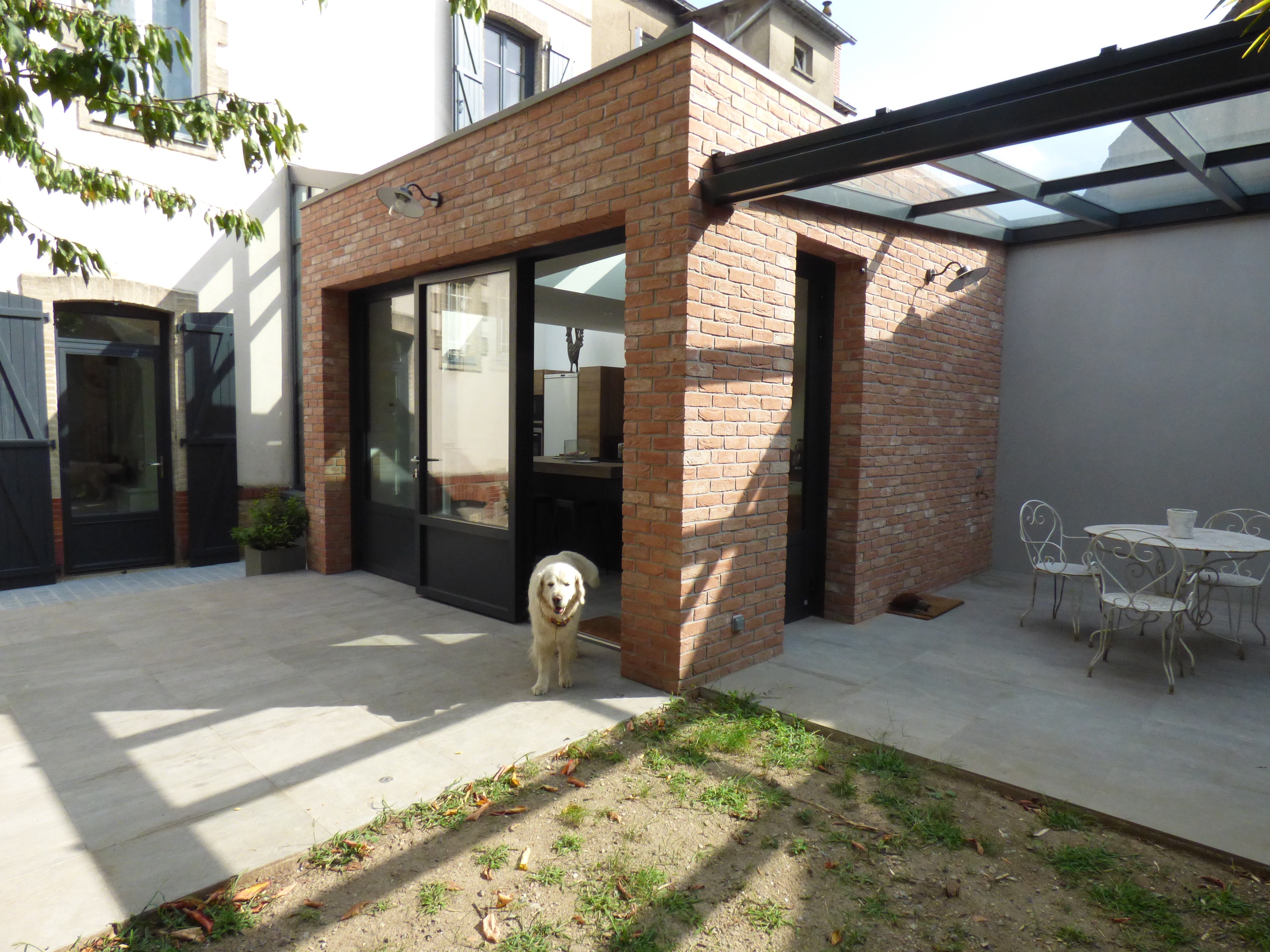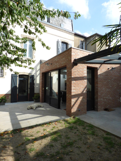 La brique rouge utilisée en parement s’harmonise avec les modénatures de la maison d’origine. La jonction entre les deux bâtiments est réalisée en verrière, préservant ainsi la transparence et l’élégance du projet.
